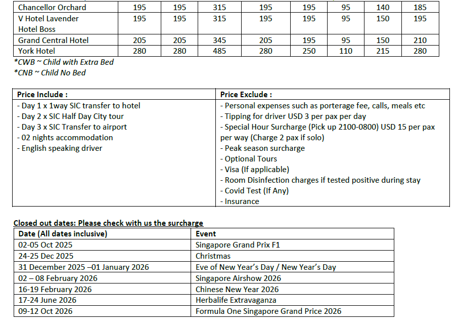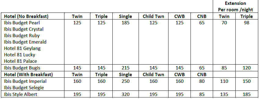 Surcharge for Solo Traveller = add USD 30 per pax based on Single ratePick up timings will be informed upon arrival in Singapore