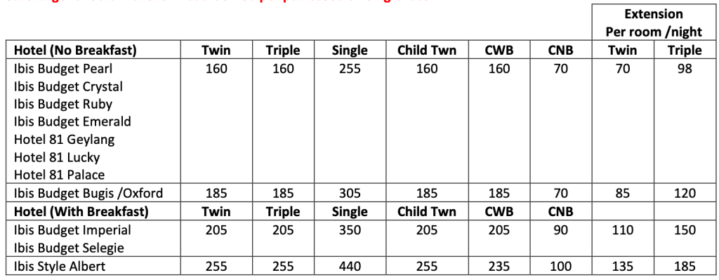 * Pick up timings will be informed upon arrival in Singapore,