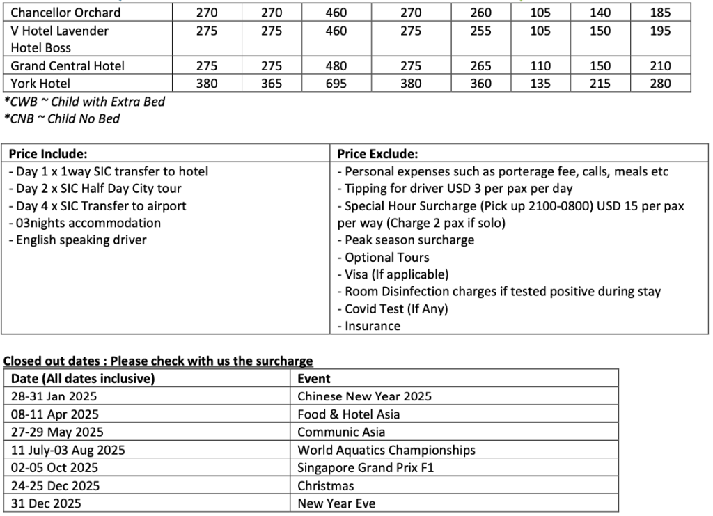 Tour Fare : USD Adult / Child (Per Person) – Min 2 pax