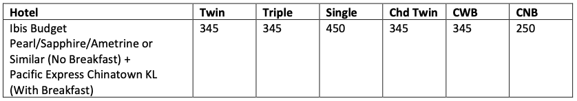 Check out. 0800am Transfer to Bus Station for Express Bus ride to Kuala Lumpur (Estimate 6 hours normal traffic). Upon arrival Kuala Lumpur Bus station, pick up and transfer to hotel for check in, free program.