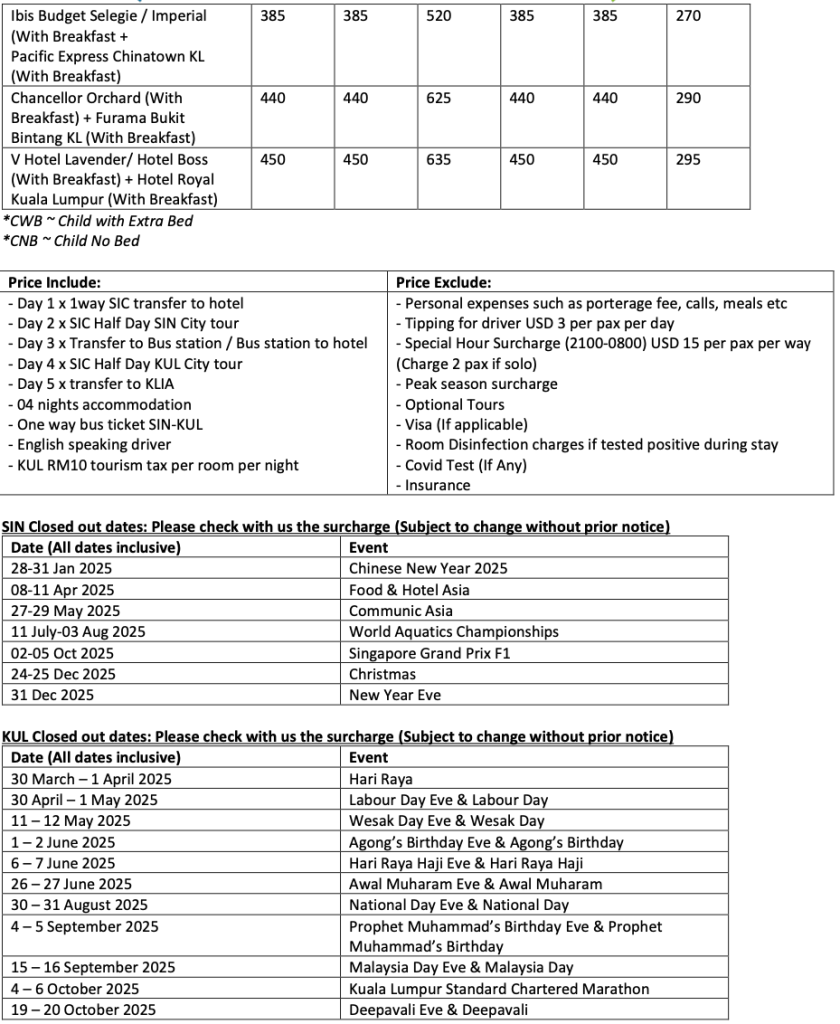 – This package is only valid for arrival and departure at Changi airport / KLIA Terminal 1/KLIA Terminal 2 only.