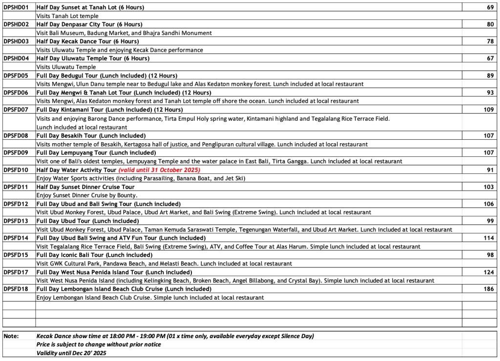 BALI OPTIONAL TOURRATES ARE NET PER PERSON IN US DOLLAR (MIN 2 PAXS)