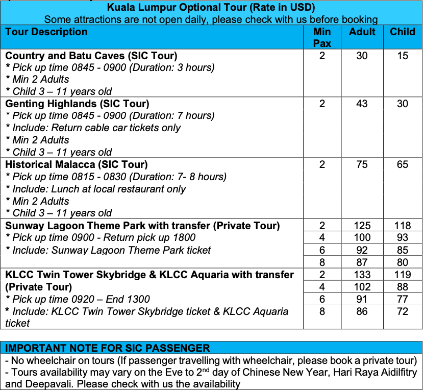 Kuala Lumpur Optional Tour 1 Day Updated 18 February 2025 All the above tours based on driver as guide (Pick and drop)